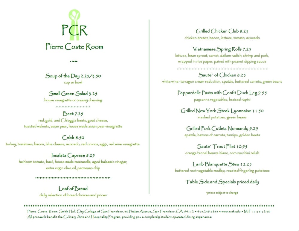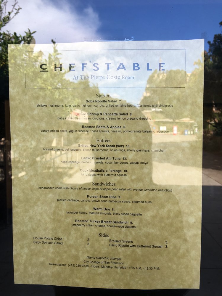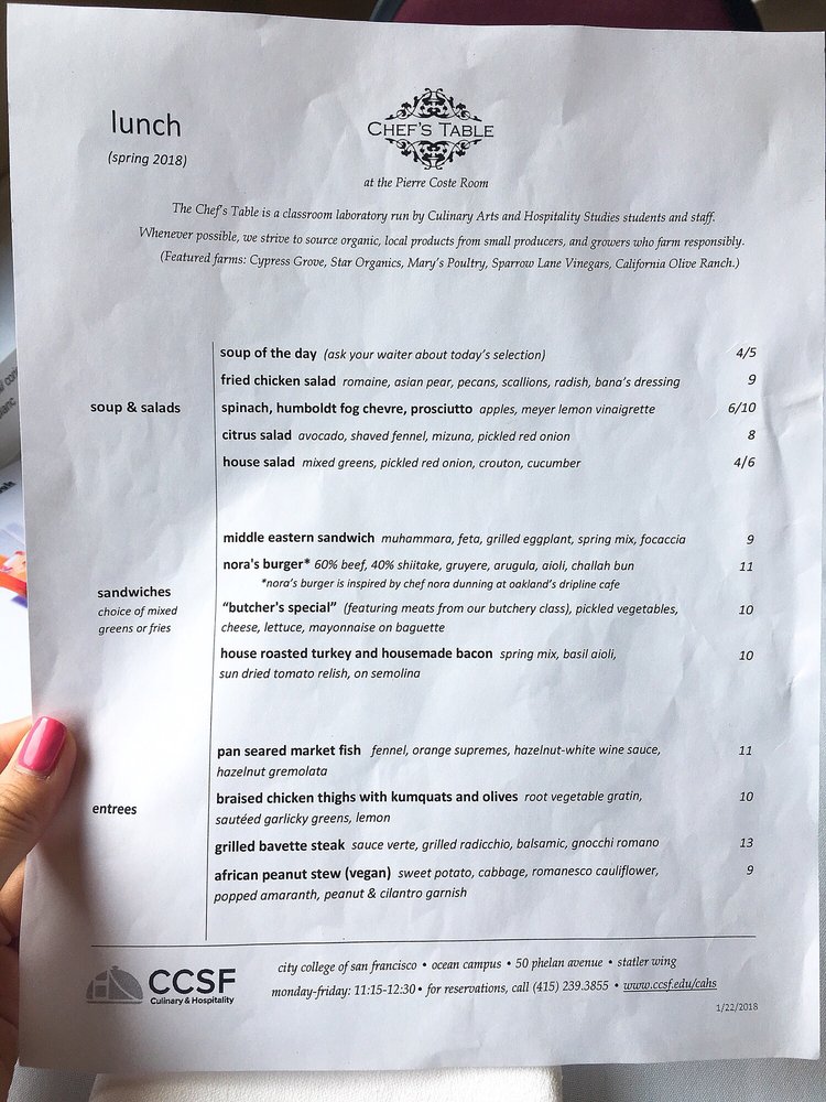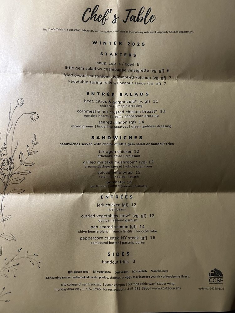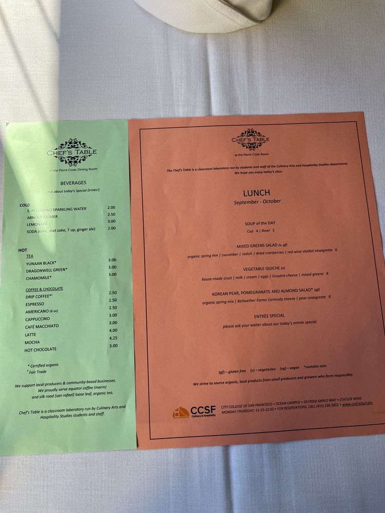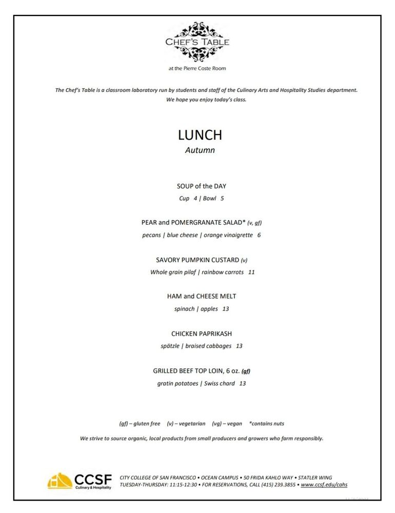 Welcome to The Chef's Table at Pierre Coste Dining Room, a hidden gem nestled in the heart of San Francisco’s City College campus. This New American eatery boasts an eclectic menu featuring tantalizing salads and hearty sandwiches, perfect for a delightful lunch experience. Signature dishes include the Little Gem Caesar salad and the indulgent Waldorf Chicken Sandwich, each showcasing the culinary prowess of student chefs honing their craft.